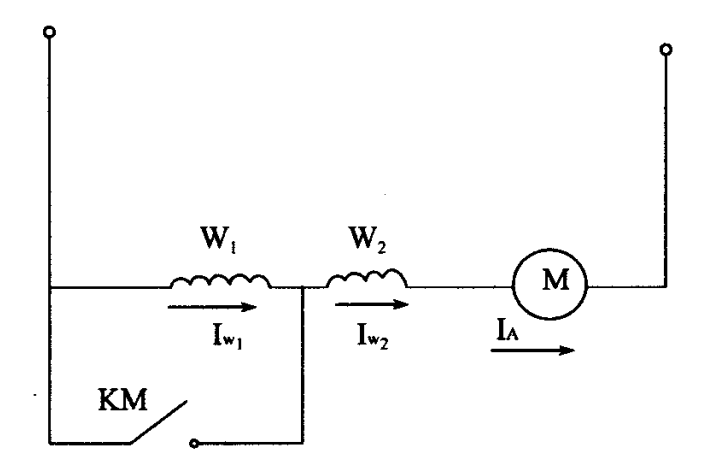 2.電動叉車直流串勵電動機改變勵磁電流IW調速。電路如圖二所示,電動機的勵磁繞組由相同的兩個分段 W1及 W2構成,通過 W1與W2的并聯換接,以改變勵磁電流實現調速。